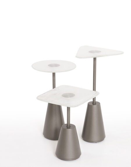 Estrutura base MDF laminado ou laqueado com contrapeso. Haste (coluna) aço carbono pintado ou inox tonalizado. Tampo lamina ou laca.